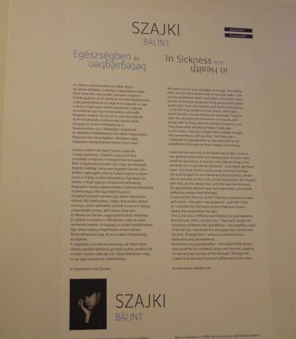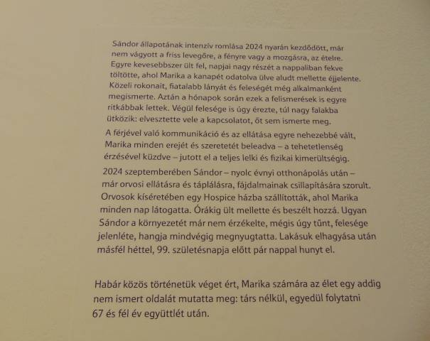 Az időskor valódi küzdelmeit ritkán látjuk. Az idősek általában valóságos vagy jelképes falak közé zárva élik meg ezeket, ahogyan a halált is. A falak gyakran tanúi voltak az ott élők fiatalkorának, majd gyengülésének és végül a búcsújának is, vagy a társas magányban töltött perceknek, óráknak, éjszakáknak egy-egy demenciában szenvedő házastárs mellett. Az izmok és csontok erejének és kimerülésének a mindennapi ápolás során, ahogyan az érzelmi kifáradásnak is. Sorozatomban ezt a láthatatlan küzdelmet és példátlan önfeláldozást volt célom megmutatni. Nagymamám társaságában követtem végig nagyapám betegségének utolsó három évét. Láttam, miként nő napról napra a nyomás a nagymamámon. Tudtam, hogy évről évre nehezebb a helyzete, ő mégsem kér támogatást. Neki a legtermészetesebb volt, hogy gondoskodik férjéről, haláláig. Soha nem fogadott ápolót, nem kiáltott segítségért, lelki és fizikai határait túllépve ment el a falig, a teljes kimerülésig. Egy életen át kísérte a férjét egészen a legutolsó pillanatáig. Nagyapám tavaly szeptemberben, 99. születésnapja előtt egy héttel hunyt el. A halállal szemtől szemben így álltam életemben először. Bár felkészülten, mégis dermedten lettem a tanúja, amint apránként elmúlik a szemem láttára a legerősebb ember, akit valaha ismertem. Ez Marika és Sándor, nagyszüleim közös története. És általuk az enyém is. Mindketten mást és mást tanítottak nekem. A nagyapa, a család rendíthetetlen feje, élete végéig a legerősebb ember maradt. Általa láthattam meg, mi az emberi elhivatottság és kitartás. A nagyanya, a család összetartója, aki férjét élete végéig egyedül ápolta és gondját viselte, amikor már minden erejére szükség volt. Általa láthattam meg, mi az igazi szeretet és önfeláldozás – olvashattuk Szajki Bálint sorait a képek között, a falakon.