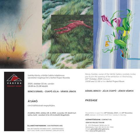 Bencs Dániel – Csapó Júlia – Vámos János: Átjáró című kiállítása nyílt meg tegnap 19 órakor a Várfok Projektszobában. A tárlat október 28-a kedd és november 20-a csütörtök között tart nyitva a Várfok utca 14-ben, ahol keddtől szombatig 12 és 18 óra között látogatható.