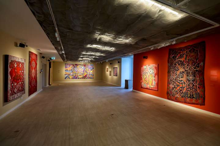 Az Összeszőve – történetek szálról szálra című tárlat középpontjában az az alapvető emberi gyakorlat áll, amely a történetek rögzítésére és továbbadására irányul: a kiállításon a festmények és szőnyegek olyan jelentést hordozó felületekként jelennek meg, amelyekben egyéni sorsok, emlékek és az emberiség kollektív tudása rejlik. Kocsis Katica esztéta kurátori koncepciója eltérő médiumokat állít egymással párbeszédbe, bemutatva a művek anyaghasználatában, mintázatában és történetmesélési módjaiban felfedezhető közös vonásokat. A tárlat a keleti és afrikai világhoz szorosan kötődő textilművészet hagyományaiból indul ki, amely élő referenciaként szolgál napjaink művészettörténeti narratíváinak újra-gondolásához.