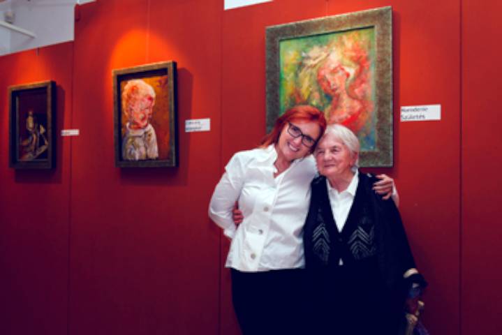 A rendhagyó megnyitón Komlósi Gábor egykori sportújságíró, a MÚOSZ új elnöke mikrofonja előtt a művésznő tartott tárlatvezetést. (A június 20-i küldöttgyűlésről idekattintva olvasható.) Beszélgetésükről kép- és hangfelvétel is készül, mely mint kérdésemre elmondta, rövidesen felkerül a szövetség honlapjára. Az augusztus 25-én keddig kiállított képek nézegetése közben finom süteményeket fogyaszthattunk, melyet esztergomi asszonyok sütöttek a vendégeknek.