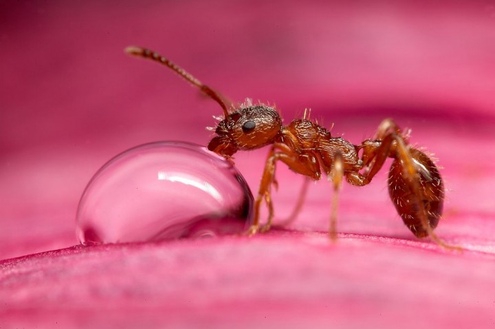 A kategóriában olyan fotók szerepelnek, amelyek az emlősökön és madarakon kívüli állatok lenyűgöző vagy ritkán látható viselkedését örökítik meg. Egy nyári záport követően indult el András a lakása közelében lévő erdőbe, ahol egy napsütötte tisztáson vöröshangyákat fedezett fel, amint virágzó mályvákra másztak fel. A díjnyertes képen a hangyák egyike egy mályvasziromra hullott esőcseppről szív vizet.