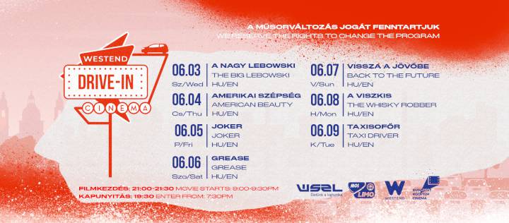 A megoldást a MOL Limóval és a Westend Bevásárlóközponttal közösen szállítja a főváros meghatározó filmvetítő formációja: talán a filmrajongóknak is legalább akkora öröm, mint a szervezőknek, hogy a kijárási korlátozások feloldásával, június 1-jén pünkösdhétfőtől ismét lesz Budapesten autósmozi – méghozzá a Westend külső parkolójában. A Westend Drive-In Cinema nevet viselő moziban a Budapest Rooftop Cinemában megszokott klasszikus filmek lesznek műsoron: A nagy Lebowski című kedvencet nem kisebb alkotások követik a nyitóhéten, mint az Amerikai szépség, a Joker, a Pomádé és a Vissza a jövőbe. Az éppen aktuális műsort az érdeklődők mindig megtalálják a Budapest Rooftop Cinema honlapján és Facebook-oldalán. Az esemény logisztikai támogatója a Waberer’s-Szemerey Logisztika Kft.