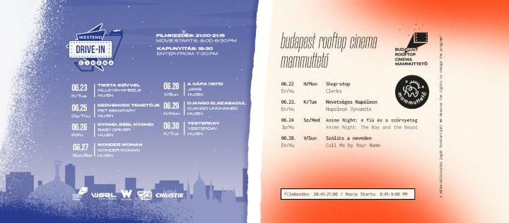 A Mammuttető sikeres startja után – a még mindig fennálló járványveszély miatt az egészségügyi előírásokat a legnagyobb gondossággal betartva – a Westend Drive-In Cinema is szeretettel várja majd az autósokon túl a gyalogosan érkezőket is. Ugyan hamarosan újranyithatnak a mozik, a Budapest Rooftop Cinema csapata szeretné, ha az autó nélkül közlekedők is kihasználhatnák az egyedülálló lehetőséget, hogy a Westend Drive-In Cinema hatalmas vásznán élvezhessék kedvenc filmjeiket. Immár nem csupán az előre beparkolt MOL LIMO-kból, de akár otthonról hozott (1200 forintos jegyáron) vagy a rendezvény szervezői által a helyszínen felállított székekből (1600 forintos jegyáron) is élvezhetik az érdeklődők az olyan kultikus alkotásokat, mint a Nyomd, bébi, nyomd, a Wonder Woman vagy az 1975-os Cápa.