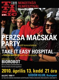 A Titanic Fesztiválon a Perzsa macskák című film április 12-én, hétfőn 21 órától a Toldi moziban, másnap 16:15-től pedig az Uránia Nemzeti Filmszínházban látható. A magyar közönség élőben is találkozhat a főszereplőkkel, ugyanis az öttagú felállásban érkező Take It Easy Hospital ? egy londoni és egy New York-i állomás között ? Budapestre is ellátogat, hogy fellépjen a Titanic buliján, a Perzsa Macskák Party-n aznap este 9 órától a Gödör Klubban!
