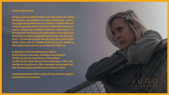 Július 27-én a JUNO11 Distribution forgalmazásában érkezik a hazai mozikba a Wim Wenders produceri felügyelete mellett született Roving Woman. Michal Chmielewski lengyel-amerikai koprodukcióban készült filmje igazi csemege a szép képek, a hangulatos zenék és a magával ragadó történetek szerelmeseinek. A történetet a női Bob Dylan, Connie Converse New York-i előadóművész titokzatos eltűnése inspirálta. Július 27-én a Puskin Mozi 20 órakor kezdődő vetítését beszélgetés követi, melyen Molnár Kata Orsolya OHNODY (Hegyi Dóra) énekesnőt és Fuller Bianka pszichológust faggatja útkeresőkről, autótolvajokról és nőkről, akik merték magunk mögött hagyni a világot.