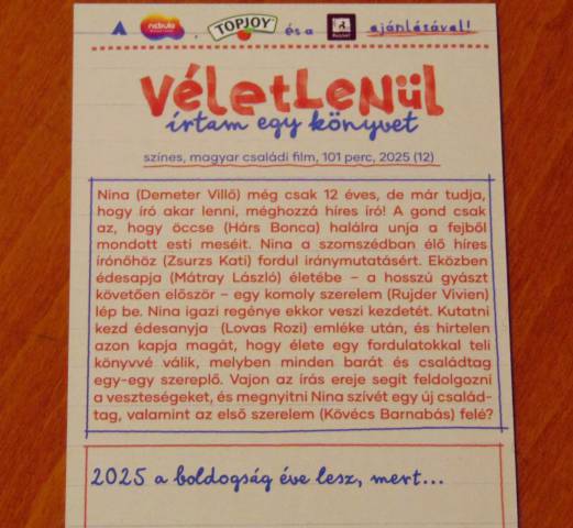 2025 legjobban várt családi filmje, a Véletlenül írtam egy könyvet csütörtöktől fut országszerte a mozikban! A Mátray László, Demeter Villő, Rujder Vivien, Zsurzs Kati, Tenki Réka és Lovas Rozi főszereplésével készült filmben közönségkedvenc zenészek is megjelennek, így a Bagossy Brothers Company és Szabó Balázs is. Lakos Nóra filmje a Nemzeti Filmintézet első zöldprodukciója, január 16-ától országszerte megtalálható a mozik műsorán a JUNO11 Distribution és az Emberi Jogi és Kulturális Alapítvány forgalmazásában.