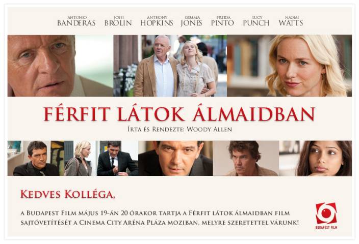 A boldogtalan házasságban élő Sally egyre jobban odavan a jóképű galériatulajdonos Gregért; a legutóbbi, gyatrán sikerült kéziratára választ váró Roy pedig a szomszéd ablakban megpillantott rejtélyes nő, Dia megszállottjává válik. Írta és rendezte: Woody Allen, operatőr: Zsigmond Vilmos, producer: Letty Aronson és Jaume Roures, vágó: Alisa Lepselter. Május 12- től láthatjuk a Budapest Film forgalmazásában.