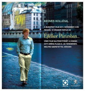 A történetben a fordulatot az hozza, hogy Gil felfedezi, hogy pontban éjfélkor Párizs egy bizonyos pontján egy fiákerbe szállva időutazásban vehet reszt, amely visszaröpíti az általa kedvelt 1920-as évekbe ? láttuk délelőtt az Aréna Pláza 8-as termében, az Éjfélkor Párizsban (Midnight in Paris) című 94 perces színes, feliratos, spanyol-amerikai romantikus vígjátékban.
