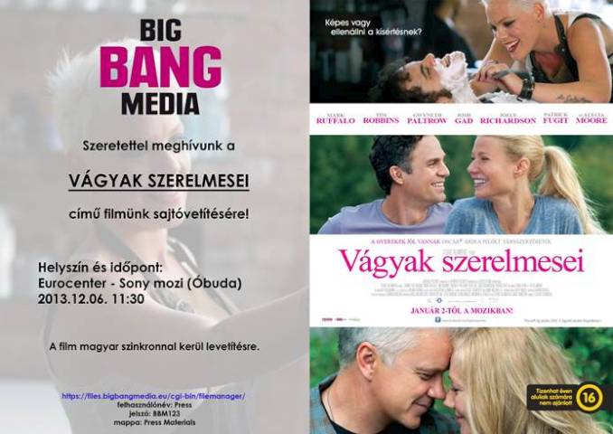 A Vágyak szerelmesei (Thanks for Sharing) című szinkronizált, 112 perces amerikai romantikus filmvígjáték magyar szlogenje: Képes vagy ellenállni a kísértésnek? Főszereplők: Mark Ruffalo, Tim Robbins, Gwyneth Paltrow. Magyar hangok: Rajkai Zoltán, Nagy-Kálózy Eszter, Haás Vander Péter, Pikali Gerda, Elek Ferenc. Rendező: Stuart Blumberg. Gyártó: Class 5 Films, Olympus Pictures. Magyar hang: 5.1 magyar szinkron. Magyarországi mozipremier: 2014. január 2-án 16 éven felülieknek a Big Bang Media forgalmazásában.
