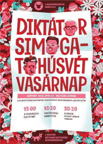 A magyarhangya április 1-jén az Átriumban bemutatja: Diktátorsimogató Húsvét vasárnap a Magyar Kétfarkú Kutya Párt közreműködésével. Program: 15 óra A CeauseČcu-életmű, 18:30 Kim Dzsongil bemutatja, 20:30 B-Movie: Nyugat-Berlin hangjai 1979-1989.