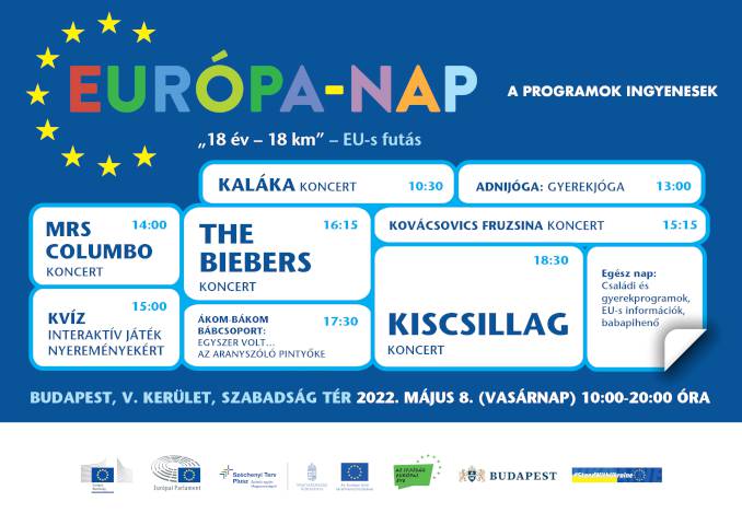 Május 8-án vasárnap az Európa-napon 10-től 20 óráig hazánk uniós csatlakozásának 18. évfordulóját ünnepeljük. Ennek alkalmából ingyenes családi és gyermekprogramok, koncertek, valamint 18 kilométeres futóverseny is várja az érdeklődőket. A hírességek közül rajthoz áll: Illés Fanni, Győrfi Pál, Nagy Dani és Túróczi Réka (Irunmom).