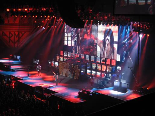 A KISS a koncertek alatt meglehetősen sok pirotechnikai elemet használ, ezek egy részét Gene Simmons maga kezeli, a többi a színpad különböző részein helyezkedik el. A látványhoz tartozik a szárazjég által keltett füst és több hidraulikus szerkezet is, amely a zenekar tagjait emeli szinte a tetőig vagy tünteti el a show különböző pontjain. Különlegesség még, hogy Paul Stanley a koncert alatt ?átrepül? egy másik színpadra, az Aréna túlsó végébe, 60 métert megtéve a közönség feje felett.