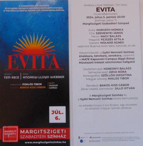 Az előadás sikere többek között Horesnyi Balázs díszlettervező, Árva Nóra jelmeztervező és Szőllősi Krisztina koreográfus munkájának is köszönhető. A két és félórás musicalt egy szünettel ma és holnap 20 órakor kezdik a Margitszigeten. A Víztoronyban ma 19 órakor nyitja meg Nyitrai László, a kiállítás összeállítója a legfrissebb tárlatot, mely a Peron-házaspár életét, Eva Peron felemelkedését és magát a korszakot dolgozza fel és eleveníti meg.