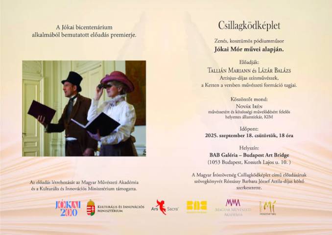 Az egyórás műsort Tallián Mariann és Lázár Balázs Artisjus-díjas színművészek, a Ketten a versben művészeti formáció tagjai adják elő. A Magyar Írószövetség Csillagködképlet című előadásának szövegkönyvét Rózsássy Barbara József Attila-díjas költő szerkesztette.