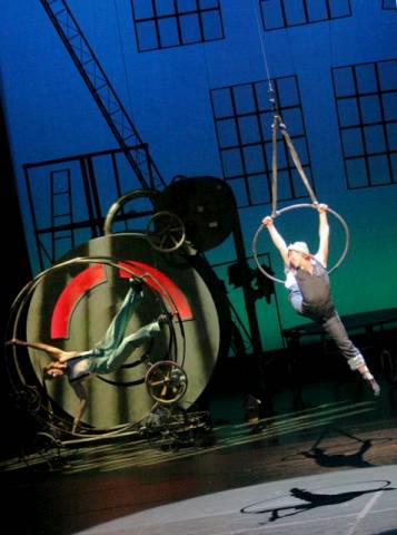 Képzelje el az elképesztőbb cirkuszi díszletet: egy gyárépületet ? ahol a munkások akrobaták és a gépek cirkuszi kellékek. Egy hangárt, ahol a nézők szeme láttára gumiember csavarodik elképesztő pózokba egy egykerekű bicikli hajtotta óriás lemezjátszó tányéron, a trapéz művészt vakmerő ugrása után egy óriás fogaskerékben forgó akrobata kapja el; a gravitáció törvényeit meghazudtoló trambulin akrobata pedig, a szemünk láttára repked és sétál a levegőben. Közép-európai premier: április 29-e, péntek 19 óra. További előadások: április 30-a, szombat és május 2-3-4-5-e, hétfőtől csütörtökig. Az előadás 4 éves kor felett mindenki számára ajánlott!