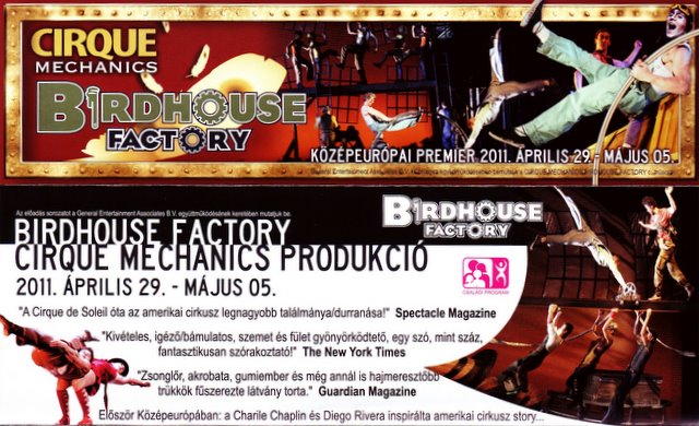 A Cirque Mechanics fantasztikus, látványos darabjaiban zene, színház, tánc és cirkusz ötvöződik ? sok-sok humorral. A Birdhouse Factory története 1935-ben játszódik; egy gyárba berepülő madár megsérül, és a munkások ápolni kezdik. A váratlan helyzet arra sarkallja őket, hogy kitörjenek a futószalag melletti monotóniából és felfedjék igazi énjüket ? cirkuszi eszközökkel. Láthatunk bohócokat, pantomimeseket, akrobatákat és zsonglőröket, akik benépesítik, életre keltik a gyárat.