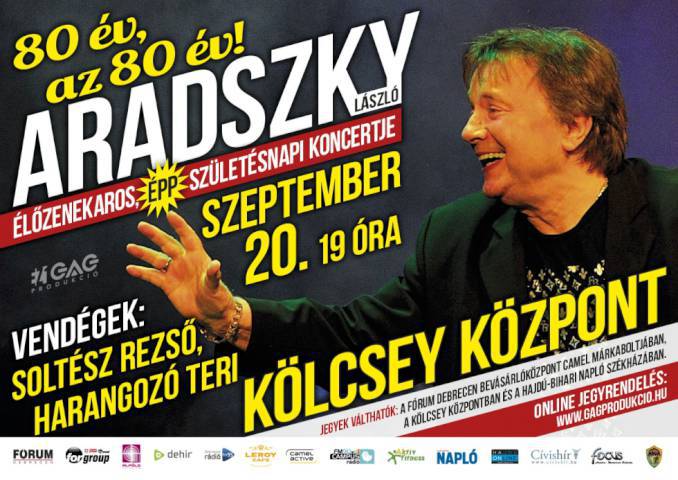 S mikor és hol láthatjuk legközelebb élőben? ? Szeptember 20-án vasárnap, 80. születésnapján Debrecenben kezdi koncertkörútját Debrecen még nem a világ vége című műsorával. Addigra elkészül a 80 év, az 80 év! című lemeze is. Marad az Alföldön, 22-én kedden Békéscsabára megy, majd 25-én pénteken Újbudán, a Fővárosi Művelődési Házban lép fel. Egy szám erejéig ötéves unokája is vele lesz a színpadon, aki az Állatkerti sétában folyton csak azt hajtogatja: Engem csak a majom érdekel! Ezt az ifjú Aradszky a tőle tíz évvel fiatalabb Ambrus Kyrivel énekelte sok-sok évvel ezelőtt. Élőben koncertjein évtizedek óta Siliga Miklós és zenekara kíséri. Számos új Kaszás Péter-számmal is készül, akit Szenes Andrea révén ismert meg.