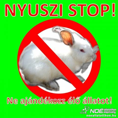A NOÉ Állatotthon Alapítvány idén is Nyuszi Stopot hirdet. Alapítványunk a korábbi években átvette a megunt húsvéti nyuszikat, kitollasodott kiscsibéket és kiskacsákat, azonban ahogy teltek az évek, megdöbbentő következtetésre kellett jutnunk ? tudtuk meg Schneider Kinga PR munkatárstól.