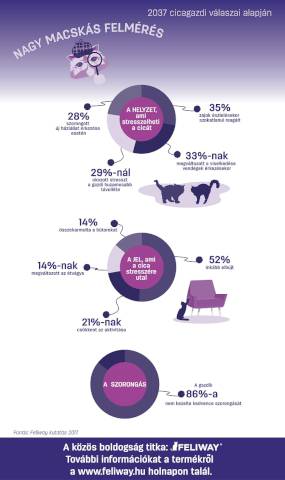 ? A cicák irigylésre méltó életük ellenére találkozhatnak olyan helyzetekkel, amelyekre szokatlanul reagálnak. A gazdik tapasztalatai alapján zajok észlelésekor (35%), vendégek érkezésekor (33%), huzamosabb külön töltött idő esetén (29%), új háziállat érkezésével (28%) vagy az állatorvosnál (26%) is előfordult már, hogy macskájuk viselkedése megváltozott. Ezeken kívül még a lakásfelújítás (14%) és az utazás (11%) során is előfordult a probléma ? ismertette a Feliway kutatásának eredményeit Dr. Szilágyi Noémi állatorvos.