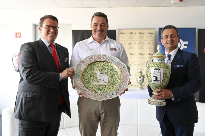 A sajtótájékoztatón bemutatták a dobogósoknak és a győztes konstruktőrnek járó díjakat. A Herendi Porcelánmanufaktúra által készített neoklasszicista stílusú vázák mintája egy különleges, távol-keleti motívum, amely a Császári bazsarózsa nevet viseli. Amint azt Simon Attila, a cég vezérigazgatója elmondta, a minta egy stilizált zöld rózsa növényi indákkal és levelekkel, a trófea alapszíne a bézs, tükrében pedig a Hungaroring sziluettje látszik. A győztes konstruktőr egy ugyanilyen mintázatú Herendi dísztálat vihet majd haza, amelynek áttört szegélyén, a speciális technikával készült porceláncsipkén a magyar nemzeti lobogó színei köszönnek vissza. A díjak 18 karátos matt arannyal díszítettek, mindegyikük kézzel készült, s összértékük több tízmillió forint.