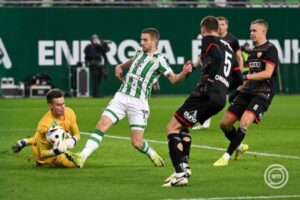 A Fradi az NB I 14. fordulóban Karakó Ferenc játékvezetésével 8723 néző előtt 1:3-s I. félidő után 3:3-t játszott a DVTK-val Varga Barna (42.), Philippe Rommers (68.) és Mohammed Abu Fani (70.), illetve Elton Acolatse (7.), Huszár Marcell (19.) és Bényei Ágoston (41.) góljaival. Fotónk MTI / Illyés Tibor felvétele.