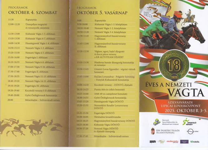 A Szilvásváradi Lipicai Lovasközpont stadionjában szombaton 4 lovas fog egyszerre starthoz állni, így az elődöntőkbe bejutó 60 felnőtt lovas 15 előfutamban indul. Minden futam győztese és a legjobb 2. helyezett jut tovább és a vasárnapi 4 középdöntő sorsolását szombat este végzik. A döntő futamokat október 05-én vasárnap 15 órától élőben közvetíti a Duna. Mindhárom nap programja élőben követhető lesz az m4sport.hu portálon.