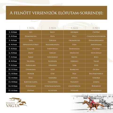 Szotyori Nagy Kristóf, a 18. Nemzeti Vágta versenyigazgatója elmondta, hogy a háromnapos lovasünnepen több mint 100 lovas indul az első októberi hétvégén Szilvásváradon. A felnőttek kategóriájában – amelynek előfutamsorrendjét ma sorsolták – 60 ló-lovas páros, a 10-13 éves huszárgyerekek közül 16, míg a 14-17 éves kicsihuszárok közül 28 páros indul.