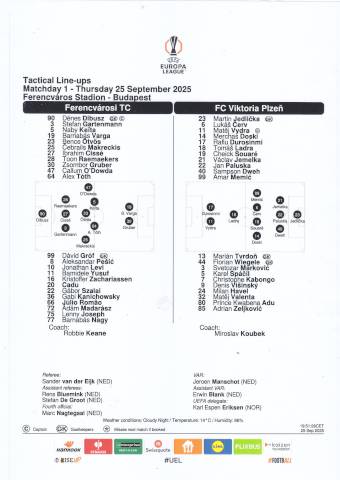 FTC: Dibusz – Cissé, Raemaekers, Gartenmann (Joseph, 74.) – Makreckis, Tóth A. (Pesic, 84.), Ötvös (Levi, 84.), Keita (Kanichowsky, a szünetben), O’Dowda – Gruber (Cadu, a szünetben), Varga Barna. Edző: Robbie Keane. Viktória Plzen: Jedlicka – Jemelka, Paluska, Dweh – Memic, Cerv, Souaré, Doski – Ladra (Visinsky, 70.) – Durosinmi (Zeljkovic, 86.), Vydra (Adu, 77.). Edző: Miroslav Koubek.