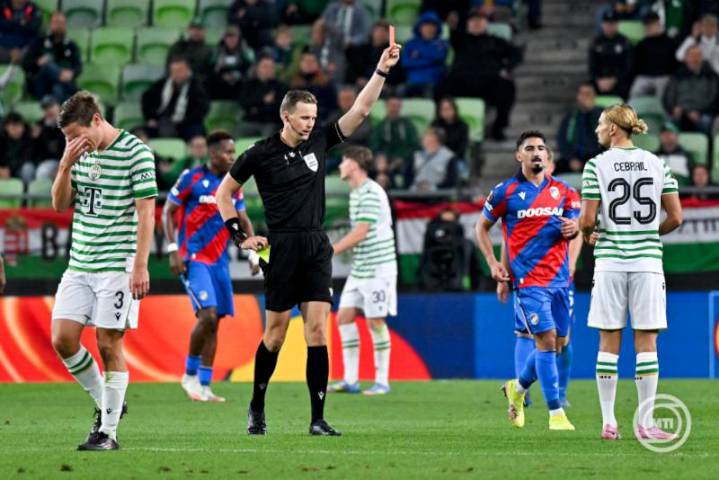 Vezette: Sander van der Eijk, segítői: Rens Bluemink és Stefan de Groot (hollandok), gólszerzők: Pesic (90+4.), illetve Durosinmi (16.), kiállítva: Makreckis (37.), sárga lap: Makreckis (10., 37.), Cissé (90.), Pesic (90+5.), illetve Durosinmi (14.), Jemelka (74.). Középpályásunk kiállítása MTI/Illyés Tibor felvétele.