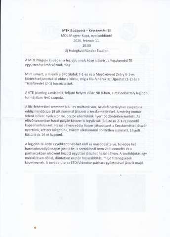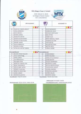 MTK-KTE 1:2 (1:2), Hungária körút, 1926 néző. Vezette: Bognár Tamás (Rózsa Dávid, Ring Kevin). Gólok: Armalas (20.), illetve Czékus (10.), Derekas (22. büntetőből). Sárga lapok: Molnár Ádin (64.), illetve Papp Milán (6.), Szabó Alex (51.). MTK: Fadgyas – Varju, Armalas, Kádár T., Vitályos (Zeljkovics, 46.) – Horváth A., Kata (Jurek, 46.) – Kerezsi (Molnár Ádin, 63.), Átrok (Polievka, 73.), Kovács Patrik – Jurina (Németh K., 63.). Vezetőedző: Pinezits Máté. KTE: Ruisz – Szabó A., Papp M. (Belényesi, 46.), Debreceni – Berki (Szojma, 78.), Derekas, Bocskay, Bolgár (Eördögh, 46.) – Czékus (Szabó B., 58.), Nistor – Beke (Bolyki, 80.). Vezetőedző: Tímár Krisztián. A KTE a március 04-ei negyeddöntőben a Győri ETO vendége lesz.