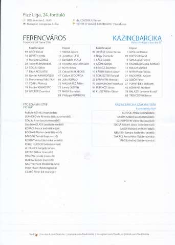 FTC-KBSC 2:1 (0:0), vezette: Csonka (Tóth II és Georgieu), gólok: Kovacevic (87.), Levi (90+4.), illetve Könyves (60.). Sárga lapok: Yusuf (87.), illetve Rácz (38.), Könyves (87.), Berecz (87.), Klausz (90.). FTC: Gróf – Gomez, Raemaekers (Levi, 77.), Szalai G. – Osváth, Kanichowsky, Abu Fani (Joseph, 70.), Corbu (Madarász, 46.), Acolatse (Yusuf, 70.) – Gruber (Nagy B., 70.), Kovacevic, vezetőedző: Robbie Keane. KBSC: Juhász – Baranyai, Rácz, Nagy Zs. (Smajlagic, 89.), Ferenczi – Berecz, Szőke (Major, 71.), Kártik (Könyves, 58.) – Klausz, Ubochioma (Radkowski, 58.), Schuszter (Nyíri, 71.), vezetőedző: Kuttor Attila. A borsodiak a MOL MK negyeddöntőben 04-én szerdán 20 órakor Diósgyőrben visszavághatnak a fővárosiaknak.