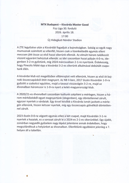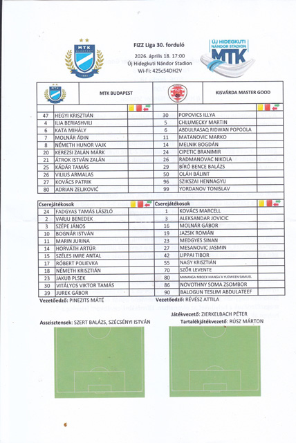MTK-Kisvárda 2:1 (1:0), Hungária körút 2497 néző, v.: Zierkelbach, gólok: Átrok (24.), Németh K. (89.), illetve Jovicic (90+1.), sárga lap: Kata (37.), illetve Chlumecky (66.). MTK: Hegyi – Armalas, Beriasvili, Kádár, Kovács P. – Zeljkovic, Kata – Molnár Á. (Vitályos, 76.), Németh H. (Plsek, 71.), Átrok (Németh K., 64.) – Kerezsi (Jurek, 64.). Kisvárda: Popovic – Cipetic, Radmanovac, Oláh, Chlumecky (Jovicic, 69.) – Matanovic, Melnik, Popoola (Szőr, 63.), Szikszai (Balogun, 69.) – Jordanov (Novothny, a szünetben), Bíró B. (Molnár G., 76.). A mérkőzés fényképes összefoglalója idekattintva olvasható.