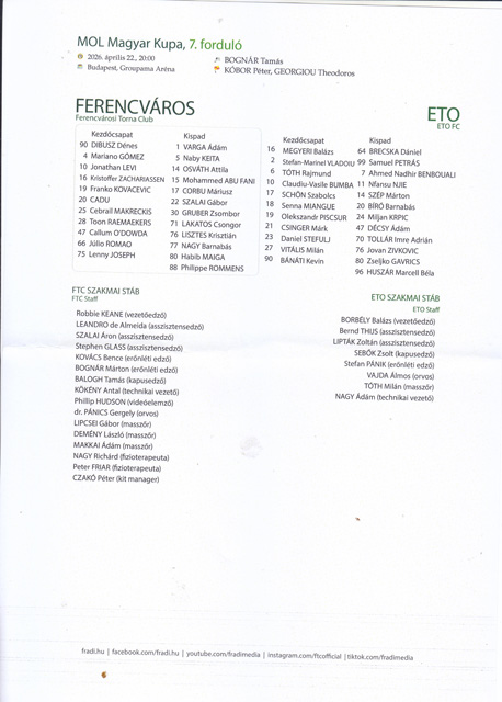 A vasárnapi győri kudarc után a Fradi tegnap visszavágott: FTC-Győr 2:2 (2:2, 2:2, 2:2) – tizenegyesekkel 3:2. Üllői út, 12.122 néző, v.: Bognár T. Gólok: Kovacevic (3.), Levi (45+3.), illetve Csinger (40.), Bumba (45+1.), sárga lapok: Kovacevic (15.), Raemaekers (53.), Gruber (120.), illetve Piscsur (18.), Vladoiu (50.), Tóth R. (119.). FTC: Dibusz – Makreckis, Gómez, Raemaekers, O’Dowda (Szalai G., 88.) – Levi (Abu Fani, 58.), Zachariassen (Corbu, 106.), Romao (Rommens, 58.) – Cadu (Nagy B., 94.), Joseph, Kovacevic (Gruber, 91.). Győr: Megyeri B. – Vladoiu (Huszár, 97.), Csinger (Krpic, 46.), Miangue, Stefulj – Tóth R., Vitális – Bánáti (Njie, 46.; Bíró B., 84.), Bumba (Gavric, 77.), Schön – Piscsur (Benbuali, 60.). A büntetőpárbajt a Fradi kezdte, a 2., 3. és 5. lövésük volt sikeres, míg a győriek csak a második-harmadikat értékesítették.