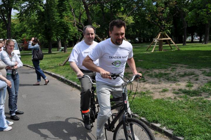 Jómagam is kipróbáltam egy kétkerekűt, mögöttem Torma Zsolt vak informatikus, az Infoalap fejlesztési vezetője foglalt helyet az egy kilométeres körpályán. Saját fejlesztésű szoftveréről márciusban beszámoltam. Nem először ült kerékpáron, bár már több mint egy évet kihagyott. Sajnos nehezen lehet megfelelő tandem kerékpárt kapni, pedig látó édesapjával szívesen kirándulna két keréken is.