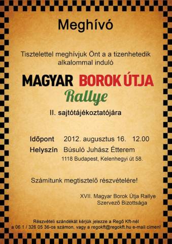 Már nem kell sokat várnunk, hogy augusztus 24-én, jövő pénteken reggel 7:15-kor a XVII. Magyar Borok Útja Rallye mezőnye az új rajthelyről, a városligeti Magyar Műszaki és Közlekedési Múzeum elől miniszteri-fővédnöki megnyitóval elinduljon ? tudtuk meg a ma déli sajtótájékoztatón a gellérthegyi Búsuló Juhász étteremben.